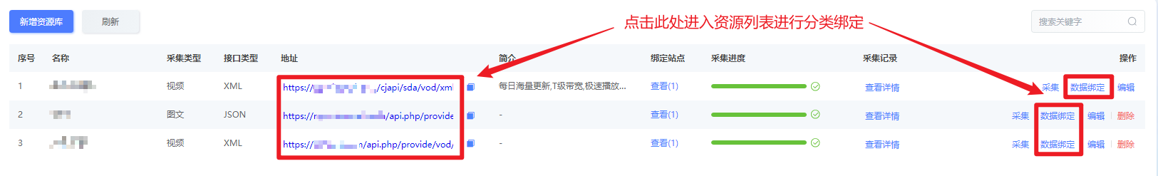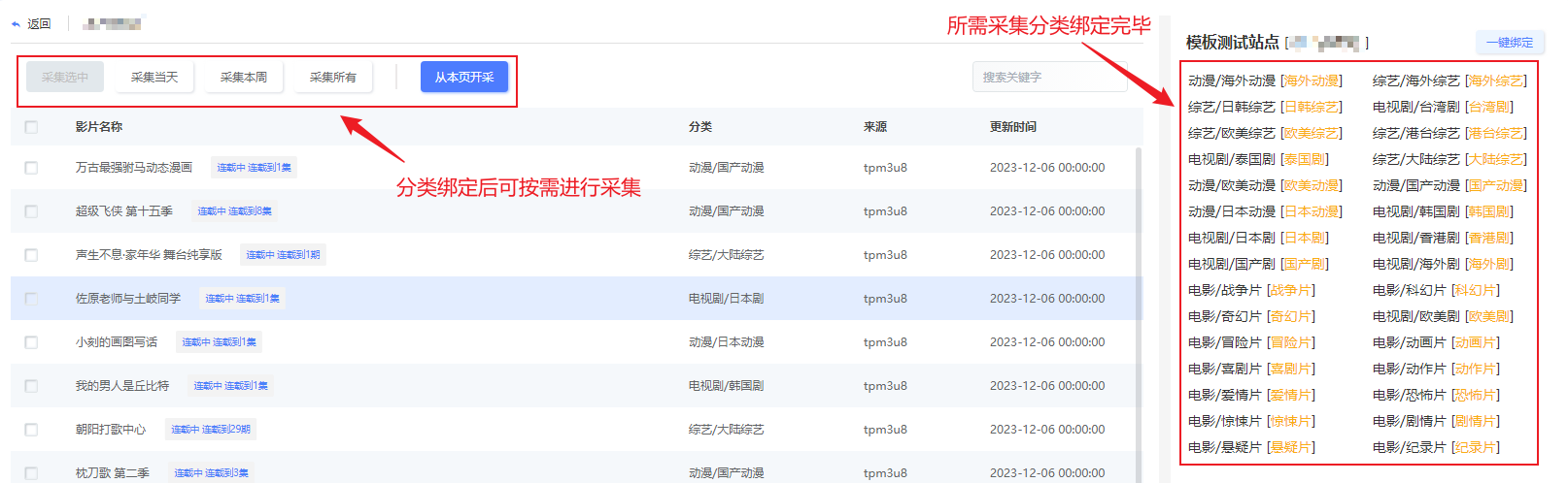 资源库添加成功后,接下来进行分类绑定,未绑定的分类数据将不能采集成功。