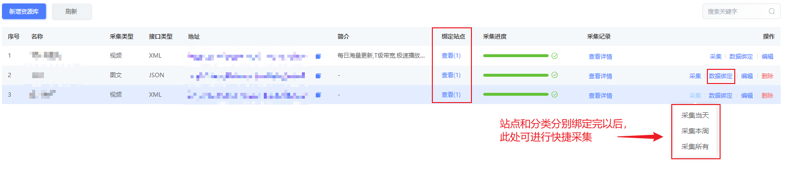 将添加的资源库进行站点绑定,需要采集到哪个站点就绑定哪个站点