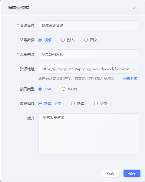 填入资源库资料,根据资源地址、采集来源及接口类型,点击测试所填信息是否有效,如果无效资源将不能添加。
